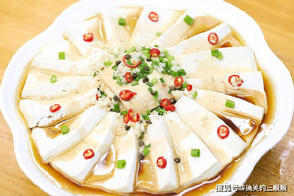 豆腐蒸好以后取出来,控出里面的汁水,均匀淋上调好的料汁,撒上葱花、蒜末、小米椒,再加几粒青花椒,等待激油。