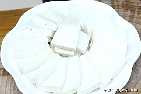准备嫩豆腐两块,切成一厘米左右的厚片,做这道菜用嫩豆腐、老豆腐都可以。