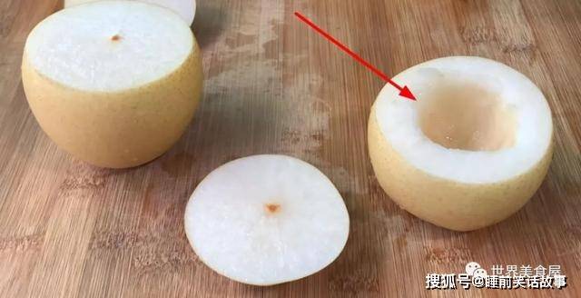 2、将雪梨的头部切下来,用刀子将中间的果肉划开,再用勺子挖出果肉,雪梨中间被掏出一个小洞。