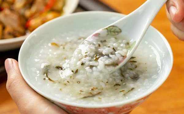 用筷子挑出腌好的芥菜叶,搅入粥中。