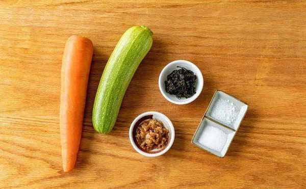 3、锅内放1汤匙食用油,加入1汤匙橄榄、1汤匙虾米和萝卜丝,炒香。加入西葫芦丝和胡萝卜丝,翻炒至生。