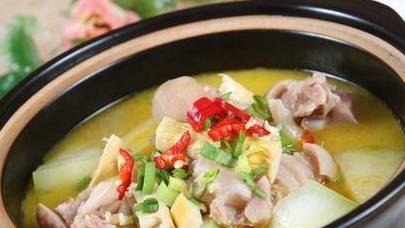 6.将炒好的猪蹄和炒料一起倒入煮锅中,加入足量的水(没过猪蹄即可),大火烧开后,调小火炖煮1个半小时左右至猪蹄熟烂,放入山药焖煮5分钟,调大火收浓汤汁,撒入百合瓣,调入1/2茶匙盐拌匀即可。