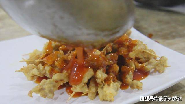 这个过程一直开中火,慢慢的把牙签肉炸到金黄色,捞出控油。