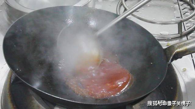 锅里加入一勺清水,一勺白糖,一勺白醋,搅匀后,加入番茄酱。