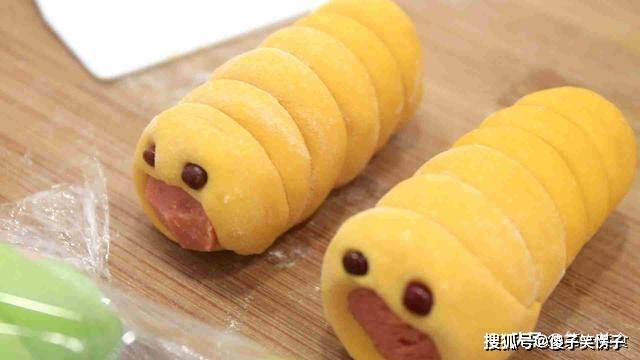取出发酵好的南瓜泥面团,照着这个方式再做几个黄色的毛毛虫。