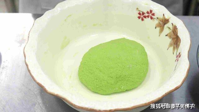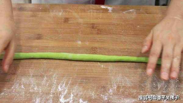 3.一个小时以后,先把发酵好的绿色面团取出,放在案板上面搓揉,搓揉好以后切下一个小面剂子,用手搓成长长的面剂子,再取一点绿色的面团继续搓揉,同样揉成长面剂子,我们揉三个就够用了。