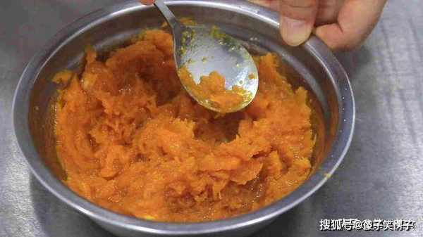 再切一点南瓜上锅蒸熟,蒸熟以后取出放在小盆中,加入白糖10克按压成南瓜泥。