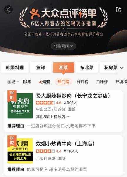 这个成功实现消费破圈的湘菜品牌叫费大厨,近期更是登顶大众点评上海湘菜热门榜第一名。这是对费大厨坚持专业大厨炒,坚持通过方法认证、师傅认证、顾客验证的三关考核来保证出品核心竞争力优势的最佳体现。