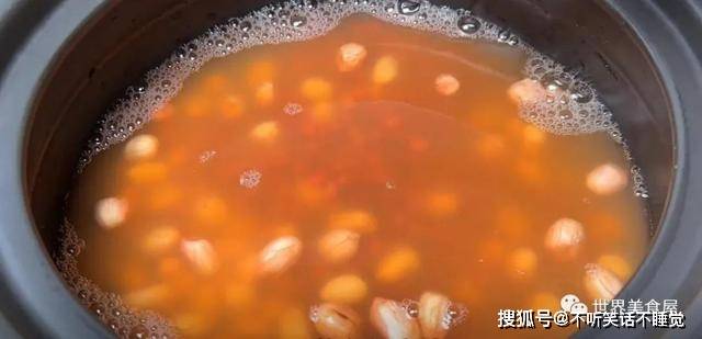 5、准备砂锅,倒入浸泡好的红豆花生,浸泡的水一起倒进去。