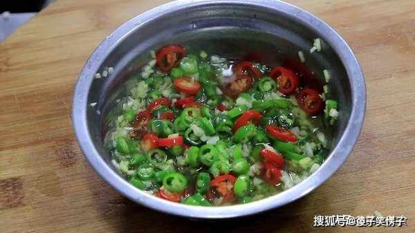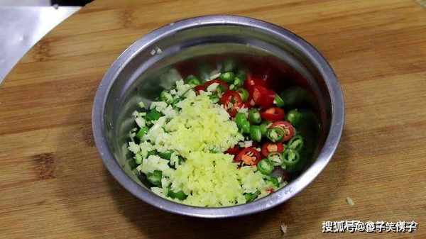 青红椒一小把,在清水中洗净后捞出,先切去辣椒蒂,再切成辣椒圈,大蒜几粒,用刀背拍散后切成蒜末。生姜一小块,先切成薄片,再改刀切成姜末,把所有配料搅拌均匀备用。