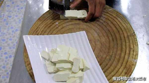 1.处理食材:嫩豆腐先切成厚片,在改刀切成1厘米大小的菱形块放入盘中备用。