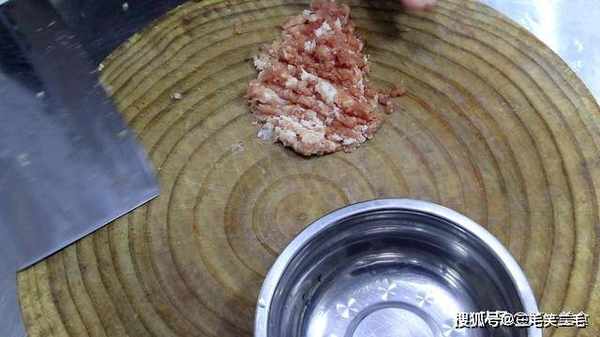 猪肉一小块,先切成均匀薄片,再剁成肉末,放入盆中备用。