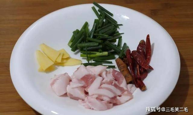 3、随后将五花肉切片,准备葱姜、辣椒、八角、桂皮等配料。