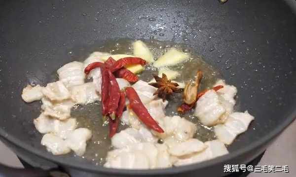 4、热锅放少许油,倒入五花肉炒出油水。放姜蒜、辣椒、八角、桂皮等配料炒香。