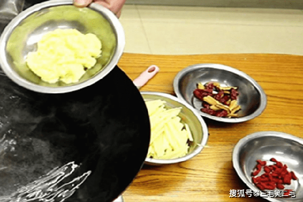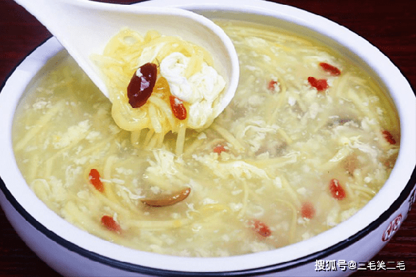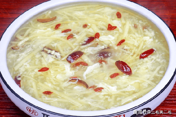 然后淋入一点水淀粉把汤羹调浓一些,把苹果丝放进去稍微煮一下,淋上蛋液飘成蛋花,就可以出锅了,最后撒上枸杞子、美味即成。