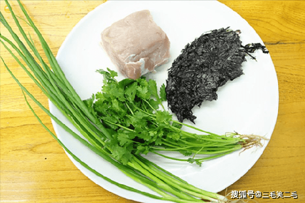 里脊肉300克,切成稍微厚一点的大肉片,然后裹上淀粉、用擀面杖把里面的纤维敲散,敲成半透明状就可以了,这样口感更加鲜滑脆嫩;一小撮紫菜用火烤出香味备用。