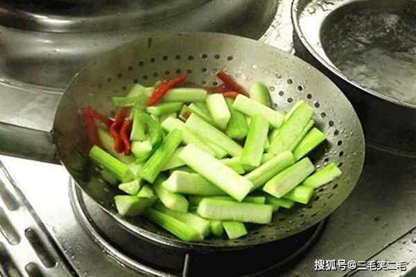 烧半锅开水,把丝瓜和青红椒放进去快速焯烫30秒钟,丝瓜断生返青以后立马倒出来,用清水冲洗、控水备用。