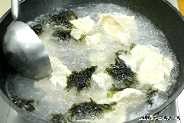 锅内烧水,开锅以后把肉片抖散放进去,肉片敲打的非常薄,基本上全部飘起来就熟了,这个时候放入紫菜,稍微烫一下即可出锅。