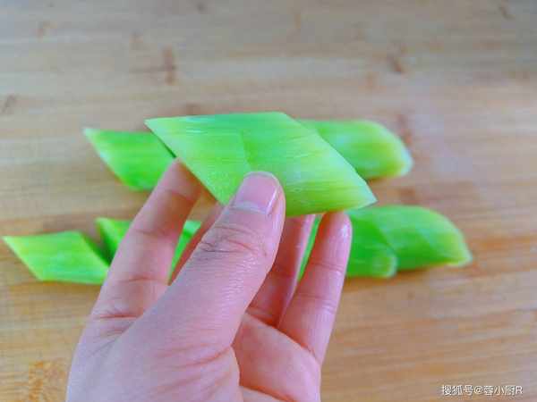 3、莴笋削好后先斜着段成小段儿,再切成菱形片。