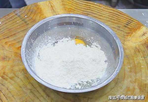 准备一个小盆,打入一个鸡蛋,加入一把干淀粉,一把面粉,淀粉和面粉的比例是一比一。