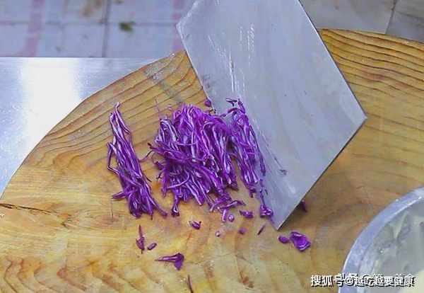 紫甘蓝切成细丝,抓匀后放在盆里,一会垫在盘底配色。