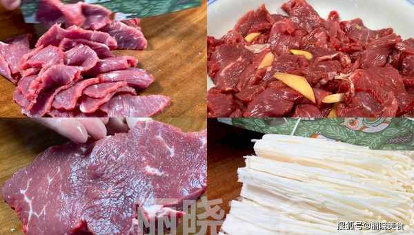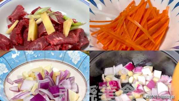 2、牛肉处理好 接着再给牛肉切一下,先给牛肉切成小块,然后再给牛肉切成薄一点的牛肉片,然后再准备一些大葱 切成葱片,接着再准备一些生姜 切成姜丝 把弄好的葱姜丝放进牛肉里面 给充分的搅拌,然后再给腌制一下