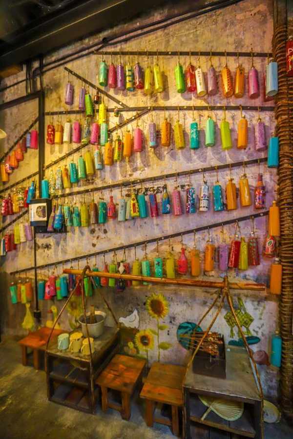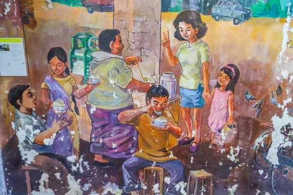 店里面还有墙上绘画,上次画的内容为旧时,小贩在街上贩卖沙爹的场景。