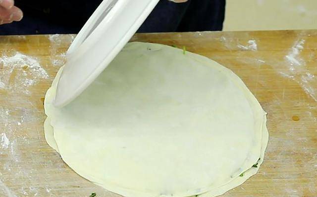 3.案板上撒上面粉,取出准备好的意大利面,揉一会排气,把面团揉成长条,拉出一些同样大小的面片,擀成面片中间厚,两边薄。擀好后,在上面放一层荠菜,打一个鸡蛋,盖上一块面团,用圆盘擀一下,不要流汁,剩下的就这样了。