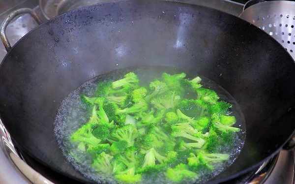 2.锅中烧开水。水开后,加入一勺盐调味。将西兰花倒入锅中,焯30秒。西兰花变绿后,将其取出。用冷水冲洗以防止其变软。