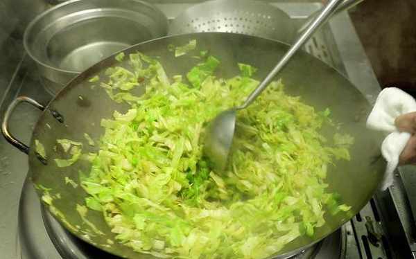 3、锅里放油烧热,将葱、蒜倒入锅中,放入卷心菜,开大火翻炒。火势一定要大。火小了,白菜容易出水,吃完就不新鲜脆了。如果白菜变绿就说明坏了,加入适量的盐、鸡粉、十三香、生抽、蚝油调味。