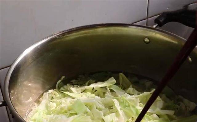 2、将切好的卷心菜放入开水锅中焯30秒左右。取出过冷水沥干备用。