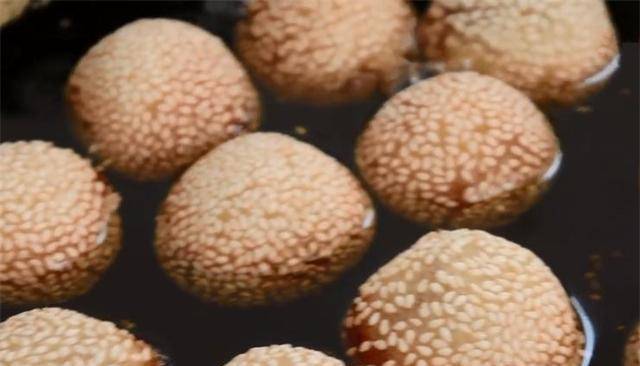 6、芝麻球全部做好后,开始炒。锅中倒入适量的油。油的量以没过芝麻球为宜。网上很多朋友反映,他们做的芝麻丸子炸了或者裂了。在这里我建议第一次做这个的朋友可以在锅里放冷油。芝麻球下锅后,随着油温的升高,速度会变慢。慢慢加热,以免锅炸裂。在这里,您需要检查好油温。在整个过程中使用低热量。温度不能太高。炒到麻球慢慢浮到上面,再用锅铲继续炒,轻轻按压,只有不断的慢压,麻球的体积才会变大。这是红豆馅麻球空心的关键。压的时候要沿着锅边压,否则油很容易溅到手上。继续转动并向下压,直到表面呈金黄色并变硬,然后即可将其从锅中取出。