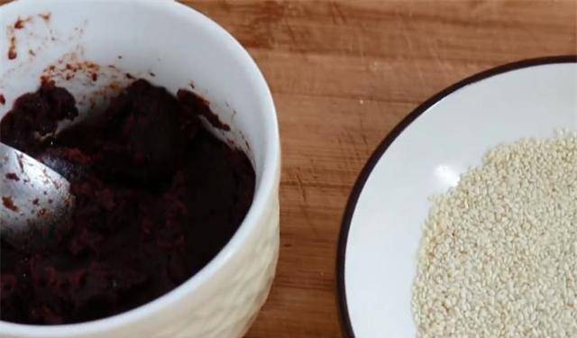 5.压扁一小团,里面包上红豆沙,擀成球状,芝麻碗里蘸少许水,擀平,撒上芝麻。