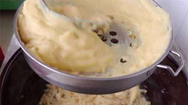 6.准备一盆凉开水开始漏鱼,然后把拌好的面糊舀到这种漏勺里,用勺子压一下漏出漏勺,就是漏鱼。