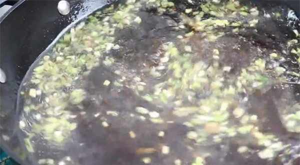 8.现在准备做酸汤。锅内油热后,放入葱花和姜末爆香,再加入适量酱油和陈醋炒香,锅中加水烧开,最后加盐和味精搅拌均匀,这道酸汤就做好了。