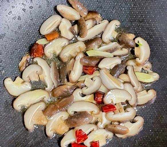 2、锅中加水,水开后放入香菇,隔水煮1分钟,捞出沥干水分。接下来,取一个煎锅,在锅中倒入油,油热后,将干辣椒和蒜片炒香,然后加入香菇翻炒1分钟。