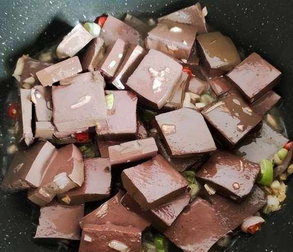 2.在煎锅中加入油。油热后,加入姜、蒜和葱,炒香。喜欢吃辣的,还可以加点小米椒提味。当香气出现时,加入鸭血并炒2分钟。.