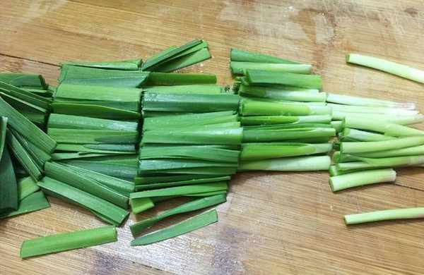 1、先将韭菜摘下,洗净切块。然后将鸭血切成均匀的块,葱、姜、蒜切碎,放入碗中。