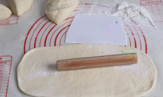 第四步:取出面团,分成小块,按照家里擀面杖的大小把面团分好。如果够大,可以把面团分成大块,然后用擀面杖擀成长方形。