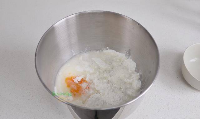 第二步:将溶解后的液体倒入一个大盘子中,然后倒入面粉、鸡蛋和剩余的水(也就是将剩余的水全部倒入溶解酵母)