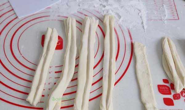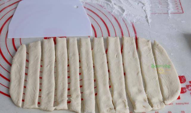 第5步:使用刮刀切割大约。4厘米宽,长度和擀好的面团一样长。您可以根据自己的口味制作长度和尺寸。