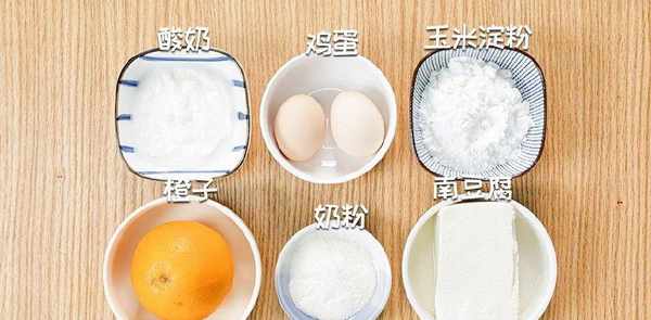 准备食材:鸡蛋:2个,奶粉:10克,酸奶:80克,橙子:30克,南豆腐:150克,玉米淀粉:50克