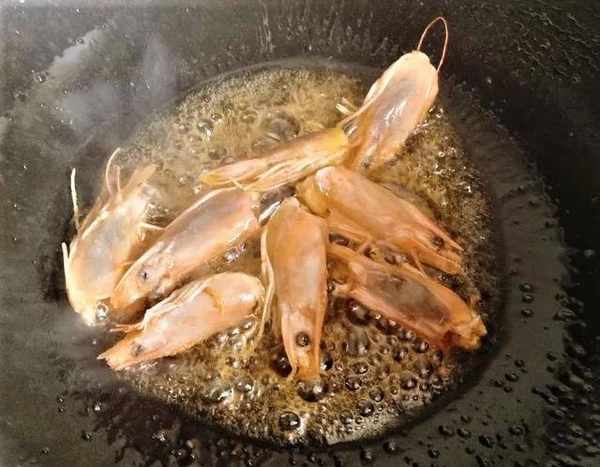 锅里放油,放入虾头,翻炒,挤出虾油。