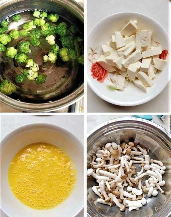 豆腐切小块;蟹味菇、白玉菇去根洗净备用。