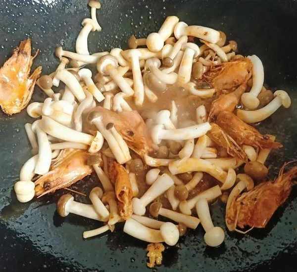 加入蟹味菇和白玉菇炒软,捞出虾头弃去。