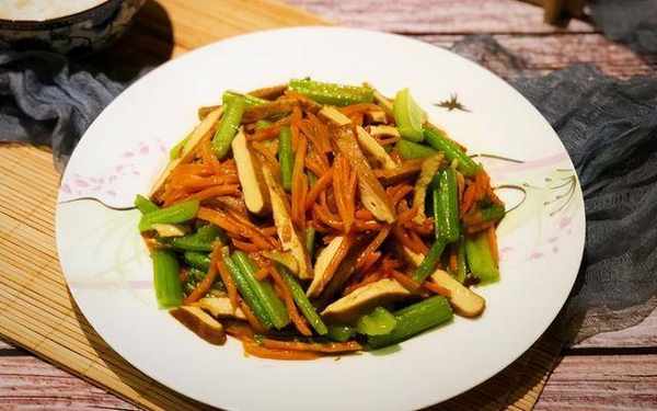 2、锅中油烧热,下姜蒜爆香,撒上胡萝卜丝炒软,下芹菜炒软,再放入干香料,加适量盐、蚝油。酱汁、鸡精炒匀。最后撒上胡椒粉,撒上适量香油即可食用。