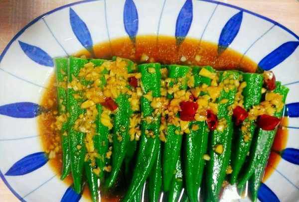 2、烧开一锅开水,加入适量的盐和食用油,放入秋葵煮1分钟,熟了捞出过凉水,沥干水分。锅里放油烧热,加入蒜茸和干辣椒炒香,淋上调好的酱汁烧开,淋上秋葵。