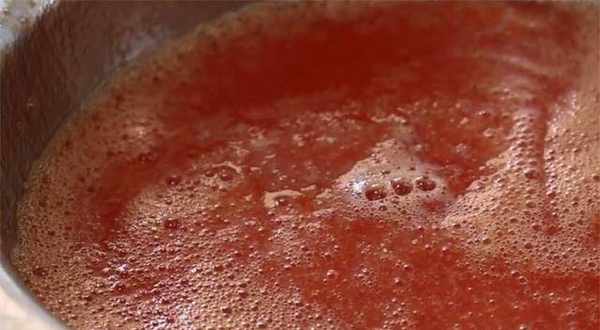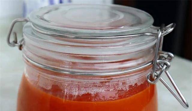 5.趁热放入事先准备好的无水无油的罐子里。一定要放在热的时候。不开封,放半年也不怕变质。最后,洒上几滴白酒,我们今天的番茄酱就完成了。