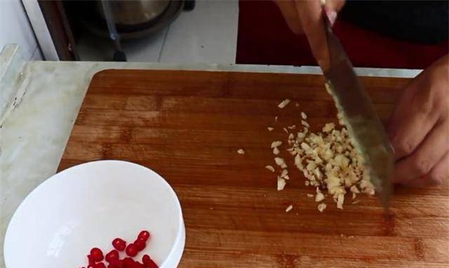 2.接下来,将红辣椒切成小圆圈。能吃辣的可以多切点,把大蒜磨碎。