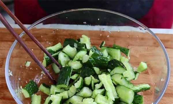 1、购买黄瓜时,最好选择软黄瓜,上面有毛刺。黄瓜买回来用清水洗净,用刀把黄瓜的两端切掉,用刀背切黄瓜,这样更容易入味。然后放入碗中,加入一勺盐腌制5分钟左右,这样黄瓜也会入味。
